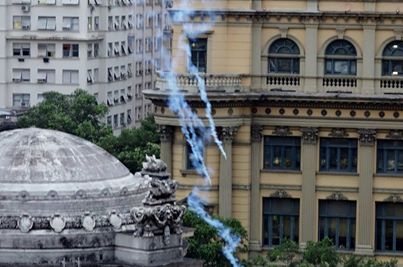 A imagem abaixo não é uma cena vinda da Síria, do Afeganistão ou Chechênia sob ataque russo, mas do centro da cidade do Rio de Janeiro. E ela não deixa dúvidas: a PM enviou atiradores para lançar bombas do alto de algum prédio contra professores que protestavam contra o draconiano plano de cargos e salários imposto pelo (des) prefeito Eduardo Paes.