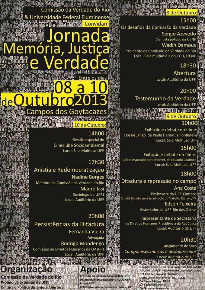 Jornada Memória, Verdade e Justiça traz Comissão da Verdade a Campos outubro 7, 2013 / Marcos Pędłowski A Comissão da Verdade do Rio e o Projeto de Extensão da UFF convidam para a Jornada “Memória, Verdade e Justiça” que ocorre entre os dias 08 e 10 de Outubro em Campos dos Goytacazes. A Programa completa segue no cartaz abaixo. Compartilhe isso: Compartilhar no X(abre em nova janela) 18+ Compartilhar no Facebook(abre em nova janela) Facebook Imprimir(abre em nova janela) Imprimir Compartilhar no Tumblr(abre em nova janela) Tumblr Compartilhar no WhatsApp(abre em nova janela) WhatsApp Compartilhar no LinkedIn(abre em nova janela) LinkedIn Envie um link por e-mail para um amigo(abre em nova janela) E-mail Compartilhar no Pinterest(abre em nova janela) Pinterest Compartilhar no Reddit(abre em nova janela) Reddit Compartilhar no Telegram(abre em nova janela) Telegram Curtir Carregando... Relacionado