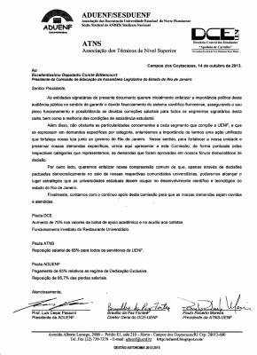 Para avançar no processo de unificação que foi iniciado na reunião comunitária que ocorreu no dia 10/10, a ADUENF, o DCE e a Associação dos Técnicos de Nível Superior decidiram preparar uma nota conjunta que já foi enviada para o deputado Comte Bittencourt, e que deverá servir como referência para as demandas que serão apresentadas na audiência.