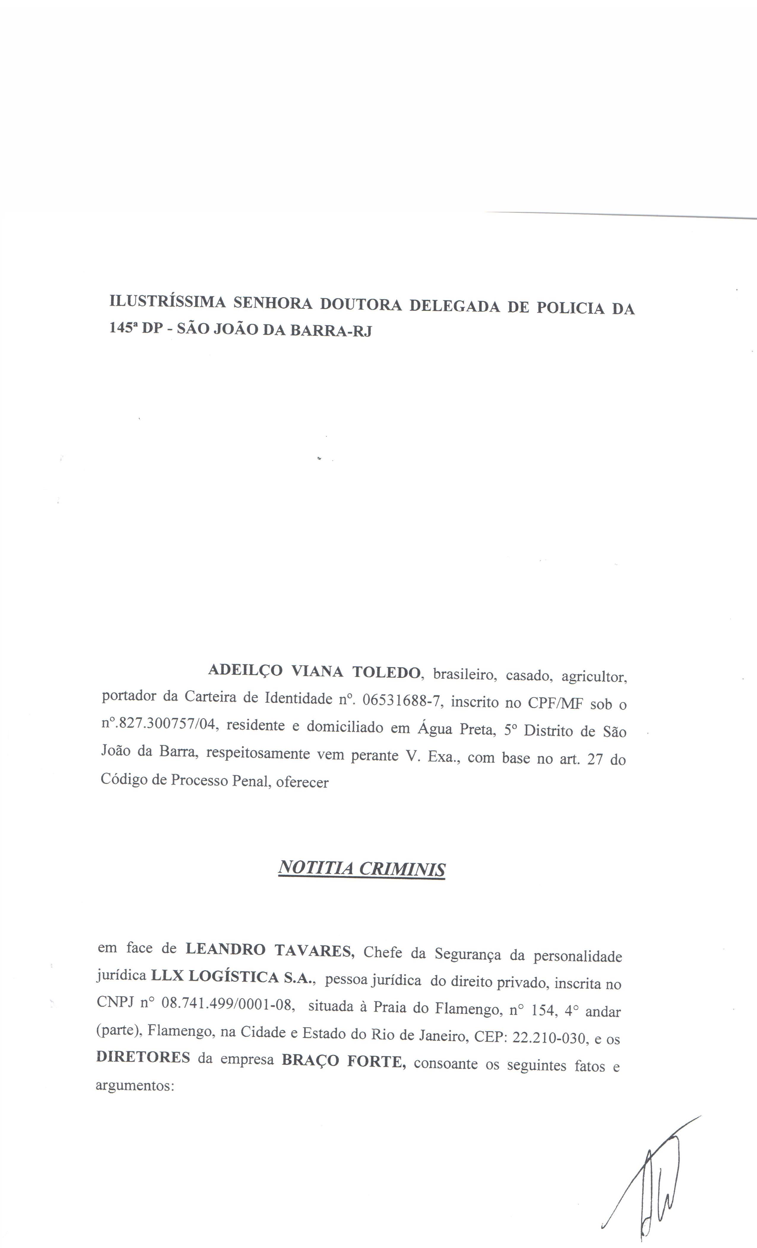 Pois bem, agora acabo de receber a cópia de uma notícia crime que foi apresentada pelo agricultor Adeilço Viana Toledo, um dos filhos do falecido Sr. José Irineu Toledo, contra o chefe de segurança da LLX Logística S.A. e contra diretores da empresa Braço Forte. E as alegações que constam da queima que já foi protocolada na 145a. Delegacia de Polícia em São João da Barra são gravíssimas, envolvendo inclusive ameaças de morte.