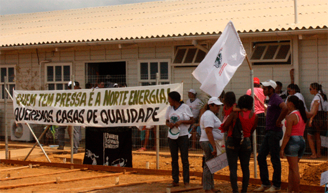 Os manifestantes protocolaram a pauta com as revindicações e agora aguardam para serem atendidos por representantes da empresa. Os atingidos da cidade de Altamira exigem que as casas a serem entregues para compensar a remoção das famílias sejam feitas de tijolos e oferecidas em três modelos de três tamanhos diferentes – de acordo com o que a própria Norte Energia havia prometido inicialmente. Iniciado o reassentamento, a empresa mudou sua proposta e passou a oferecer apenas um modelo de casa, de 63 m², e feita em concreto pré-moldado. “Essas casas são verdadeiras latas de sardinha com prazo de validade. Mal começaram a ser construídas e já estão rachando”, afirma Nalda Oliveira, uma das atingidas, participante do grupo de base da rua 8 do MAB.