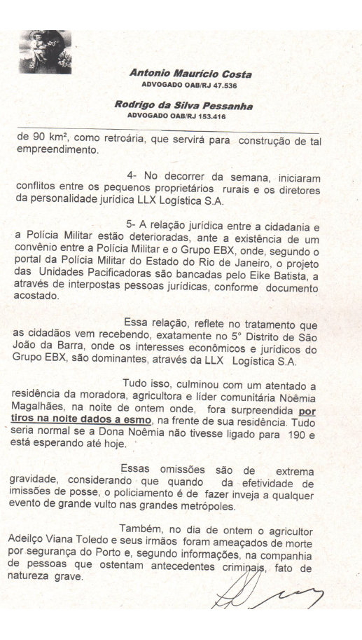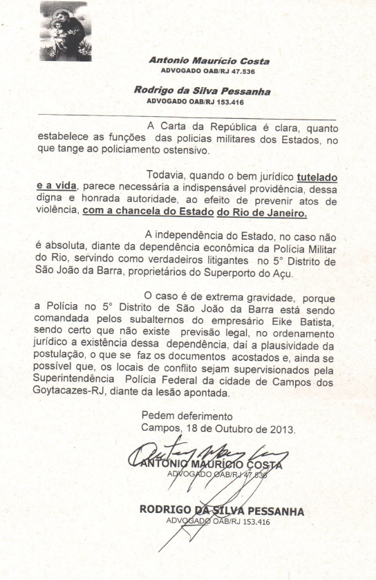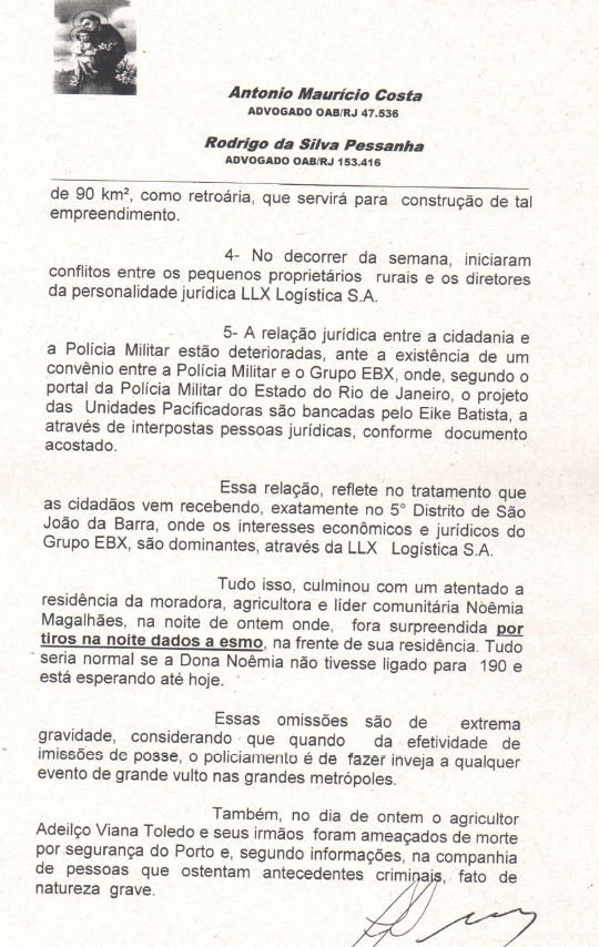 Os advogados Antonio Maurício Costa e Rodrigo da Silva Pessanha ao Ministro da Justiça enviaram denúncia ao ministro da Justiça, José Eduardo Cardozo, relatando as ameaças contra a família do falecido agricultor José Irineu Toledo e o atentado cometido contra a propriedade da Dona Noêmia Magalhães.Segundo relato oriundo do próprio Ministério da Justiça, o ministro José Eduardo Cardozo abriu um processo (08001015806201327), e enviou cópia da denúncia para a Secretaria Nacional de Segurança e para o Departamento de Polícia Federal em Brasília.