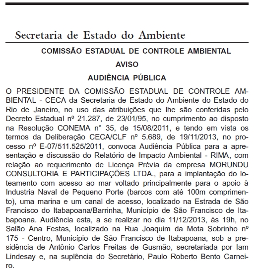 Como já havia sido informado aqui neste blog, mas agora foi tornado oficial pela Secretaria Estadual do Ambiente (como mostrado na imagem acima, no dia 19/11/2013 será realizada uma audiência pública no Salão Ana Festas, situado na Rua Joaquim da Mota Sobrinho, 175 no centro de São Francisco do Itabapoana, para analisar o requerimento de licença prévia para a implantação de um loteamento, uma marina e um canal de acesso.