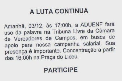Como mostra o convite acima, a diretoria da ADUENF está convocando a membros da comunidade universitária da UENF e interessados de todos os segmentos da população campista para participar nesta 3a. feira (03/12) da “Tribuna Livre” que é promovida pela Câmara de Vereadores de Campos dos Goytacazes. A participação da ADUENF se dará em torno das 17:00 horas, e a diretoria está preparando uma apresentação que apresente a real situação dos salários pagos na instituição em confronto com outras instituições públicas de ensino superior brasileiras.