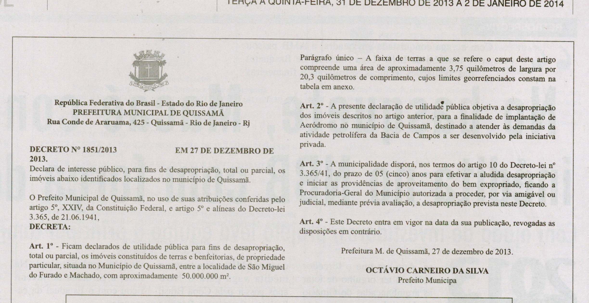 Trecho do decreto publicado nesta terça-feira, dia 31, pelo prefeito de Quissamã Octávio Caneiro, que destina uma de 50 milhões de metros quadrados para fins de desapropriação