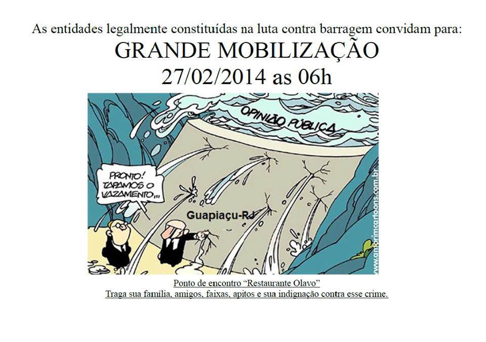 Dia 27 de fevereiro (5ª. Feira), será realizado protesto de agricultores e moradores do Município de Cachoeiras de Macacu – DIGA NÃO À CONSTRUÇÃO DE MEGA-BARRAGEM DA REFINARIA DO COMPERJ / PETROBRAS NO RIO GUAPIAÇU.