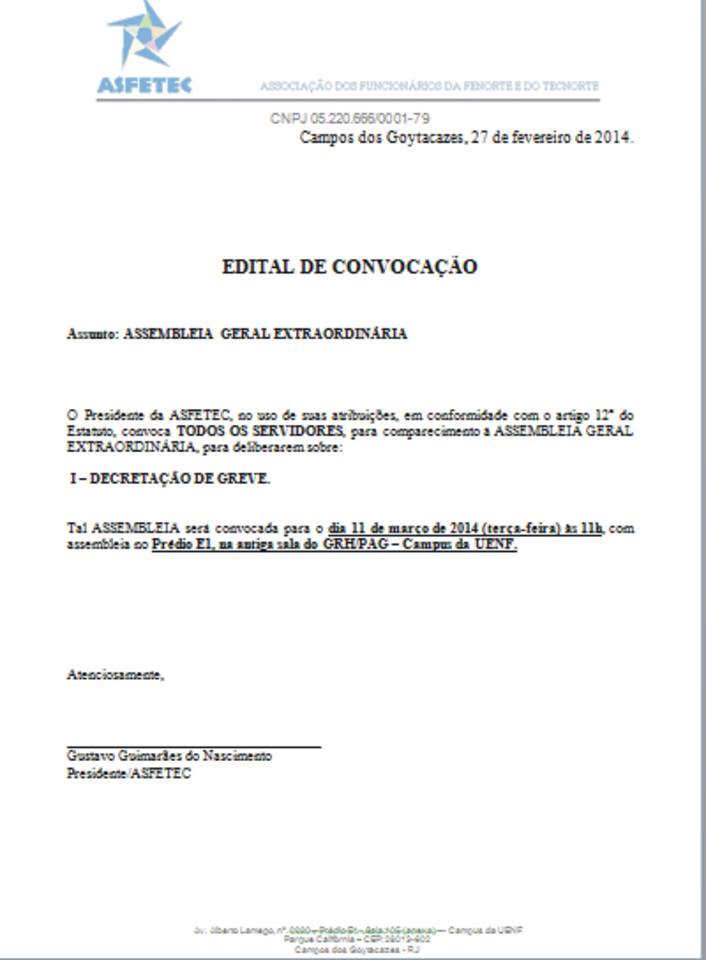 Em recente intercâmbio de argumentos com o jornalista Esdras Pereira, o presidente da Fundação Estadual do Norte Fluminense (FEENORTE), Nelson Nahim ressaltou a eficiência dos trabalhos deste órgão. Pois bem, então é de se esperar que a convocação que está sendo feita pela Associação dos Funcionários da Fenorte e Tecnorte (ASFETEC) para esta terça-feira (11/03) com um único ponto de pauta (decretação de greve) seja recebida por ele com naturalidade e apoio. Afinal, se o desempenho dos trabalhos é de alta qualidade, o justo e correto é que os salários dos servidores também sejam. Ou não?