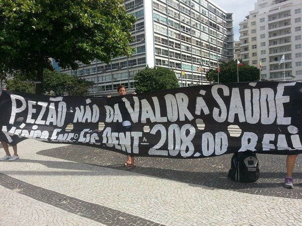 “Pezão massacra a saúde!”, ostenta uma faixa no calçadão da praia de Copacabana na tarde desta quinta-feira (1), Dia do Trabalhador. O protesto se trata de um ato realizado pelo Sindsprev, sindicato dos servidores da saúde. “Estamos aqui para denunciar o sucateamento da saúde pública, a privatização e a falta de condições dignas dos profissionais. Somos doentes cuidando de doentes. Temos um governo genocida que acaba com as condições de trabalho dos servidores da saúde”, bradava ao microfone uma funcionária do IASERJ (Instituto de Assistência dos Servidores do Estado do Rio de Janeiro), que desde 2012 funciona somente como ambulatório.