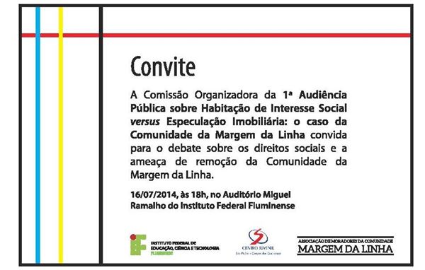A audiência será realizada na próxima 4a. feira (16/07) no campus centro do IFF. O convite vai logo abaixo, e todos aqueles que se preocupam com a construção de uma cidade mais democrática e socialmente justa deveriam comparecer. A hora de apoiar a Comunidade da Linha é agora!