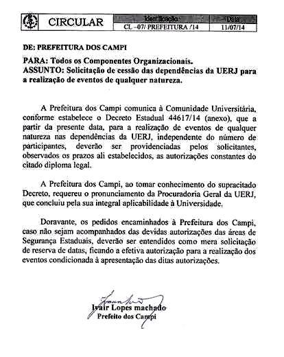Enquanto a prisão da Coordenadora da Pós-Graduação em Filosofia é prorrogada por mais cinco dias fazendo com que a Prof. Doutora Camila Jourdan permaneça encarcerada em Bangu, a Prefeitura do Campus (Maracanã) da UERJ faz circular nota em que requer prévia autorização para qualquer tipo de reunião dentro da universidade. Mais um ataque à liberdade de reunião e ao direito de manifestação com a assinatura do executivo estadual do RJ.