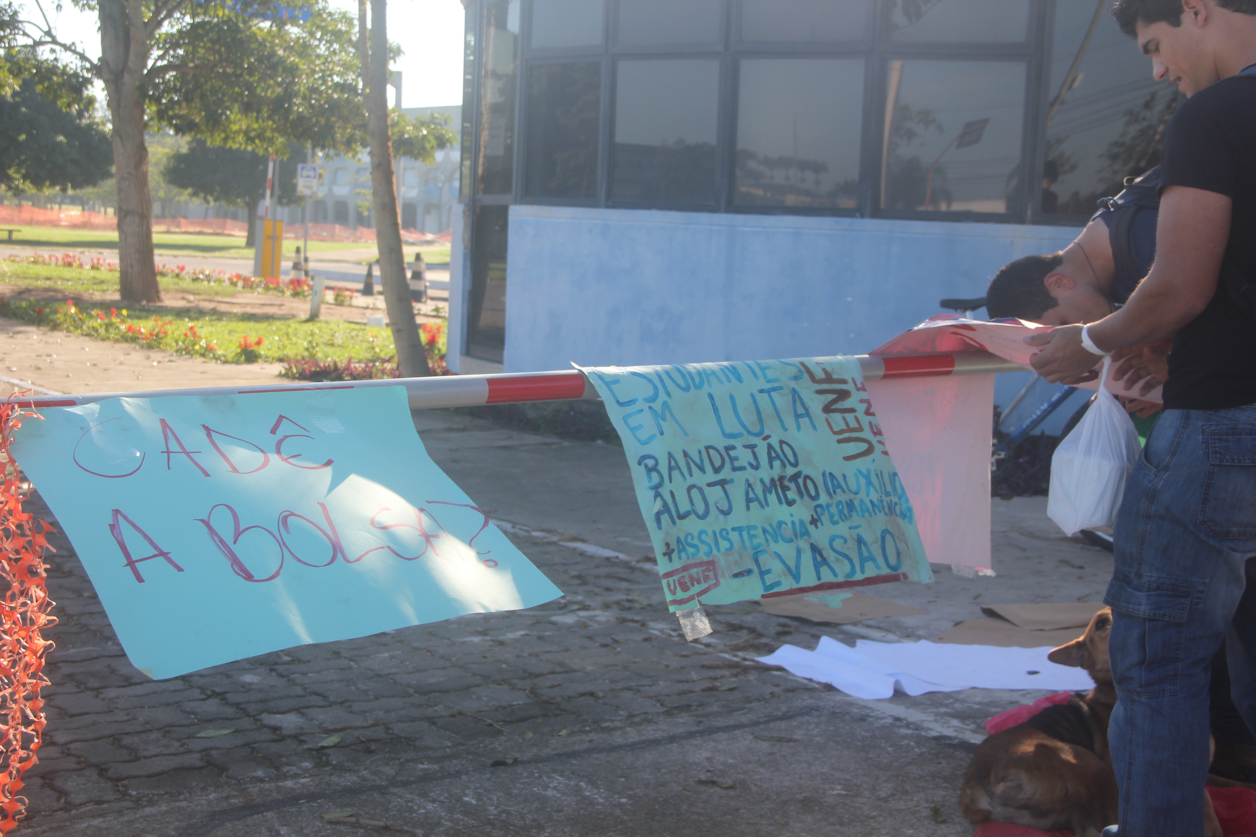 As entradas do campus Leonel Brizola da Universidade Estadual do Norte Fluminense (UENF) estão lacradas na manhã desta segunda-feira pelo movimento estudantil, numa forma de protesto que visa denunciar a quebra do compromisso pelo (des) governador Luiz Fernando Pezão em equiparar os valores das bolsas de auxílio-cota e apoio acadêmico ao que já é praticado na Universidade do Estado do Rio de Janeiro (UERJ). As lideranças do Diretório Central dos Estudantes (DCE) que estão presentes na manifestação também apontam para o inconformismo dos estudantes contra o que muitos deles consideram uma postura de omissão da reitoria frente ao processo de asfixia financeira a que a UENF vem sendo submetida pelo (des) governo estadual liderado por Luiz Fernando Pezão.