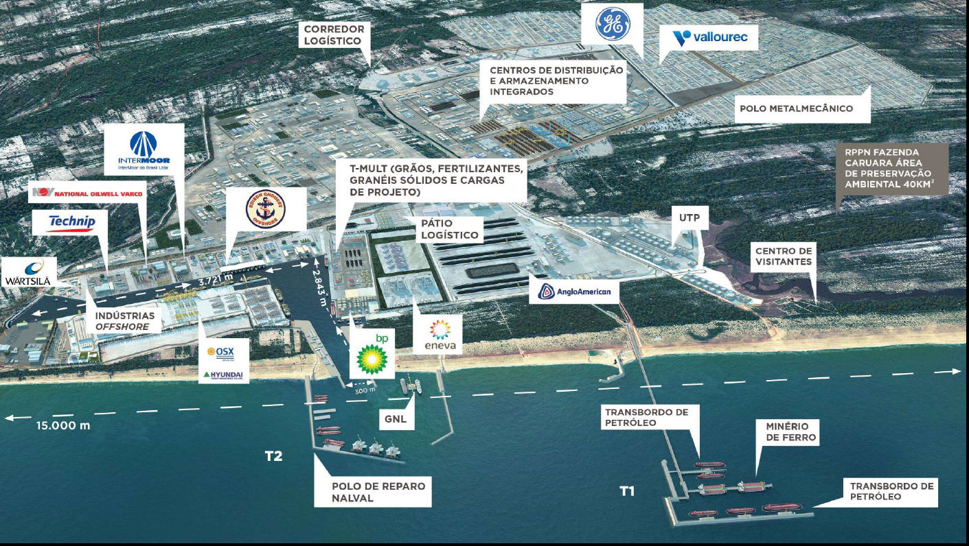 Coloco dois exemplos abaixo que mostram um visão bem diferente de a quantas anda o Porto do Açu.  A primeira foi tirada de um apresentação corporativa preparada pela Prumo Logística em julho de 2014 e mostra vários parceiros de peso que estariam atuando ou em vias de atuar dentro do porto.