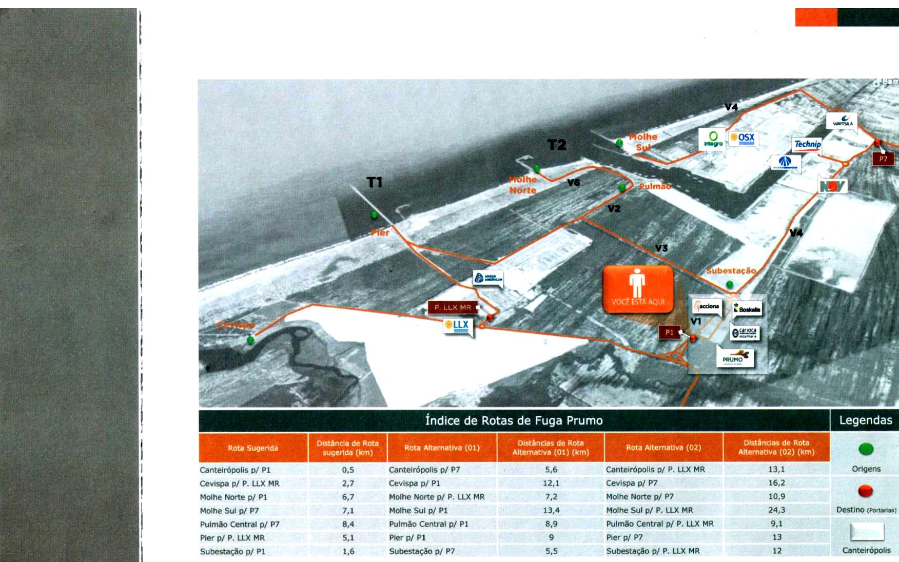 A segunda maquete consta de um panfleto voltado a orientar regras de segurança para operários que atuam trabalhando das obras de instalação do Porto do Açu, e já é bem menos abundante em termos de logotipos famosos, o que demonstra que a maquete acima pode estar mais no campo dos desejos do que da realidade objetiva do empreendimento. Uma coisa que eu não entendi na maquete abaixo é a manutenção do logotipo da LLX, já que a empresa teria sido sucedida pela Prumo. Mas como existiam várias “LLX”, há sempre a possibilidade de que uma delas sobreviveu e é parceira da Prumo no Porto do Açu.