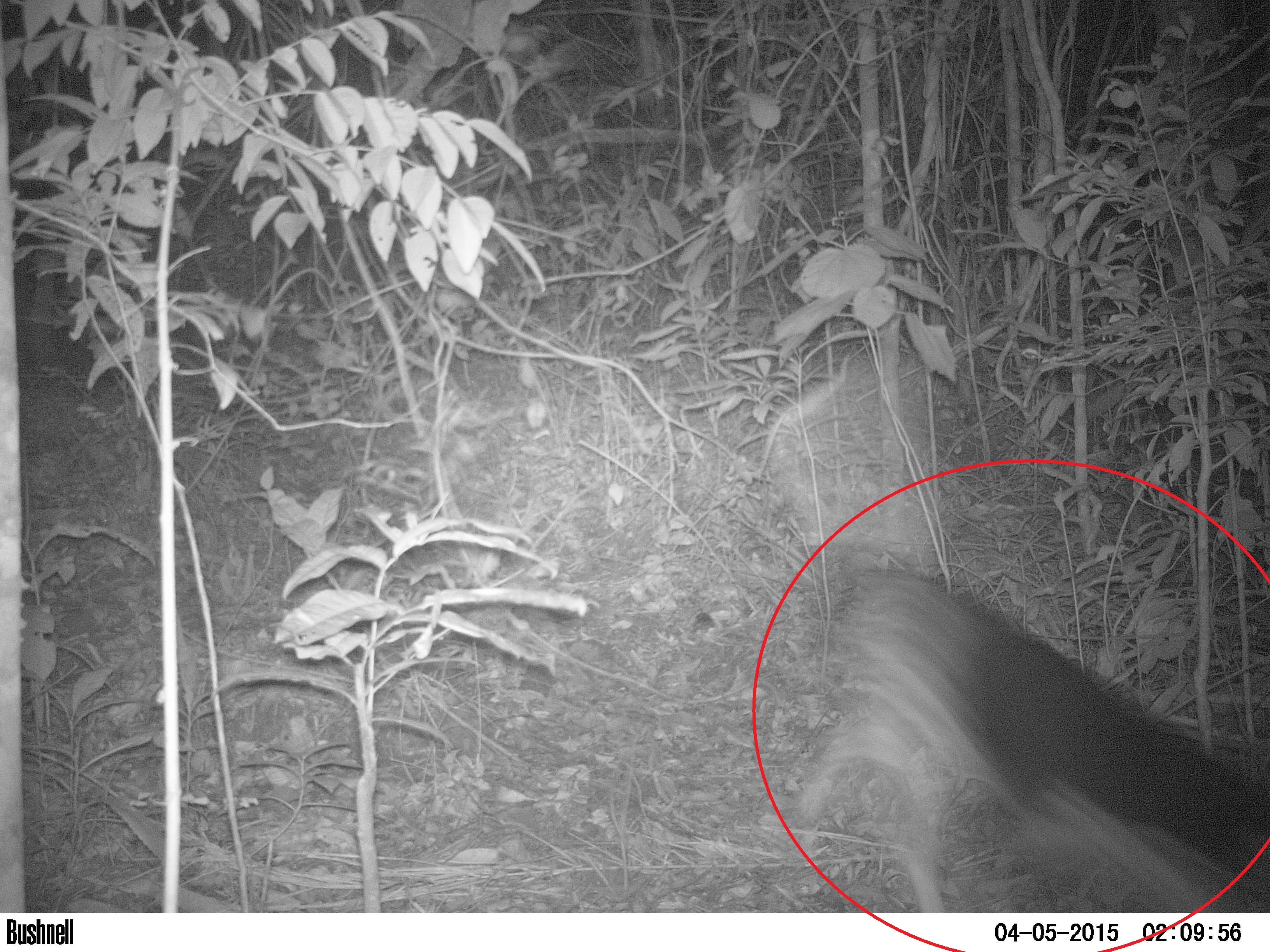 Cão feral detectado por uma armadilha fotográfica dentro de uma área protegida pela ONG Iracambi, mostrado no circulo vermelho no lado direito inferior da imagem.