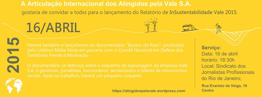 Lançamento do “Relatório de Insustentabilidade da Vale 2015” e do documentário “Buraco do Rato” nesta quinta-feira, dia 16
