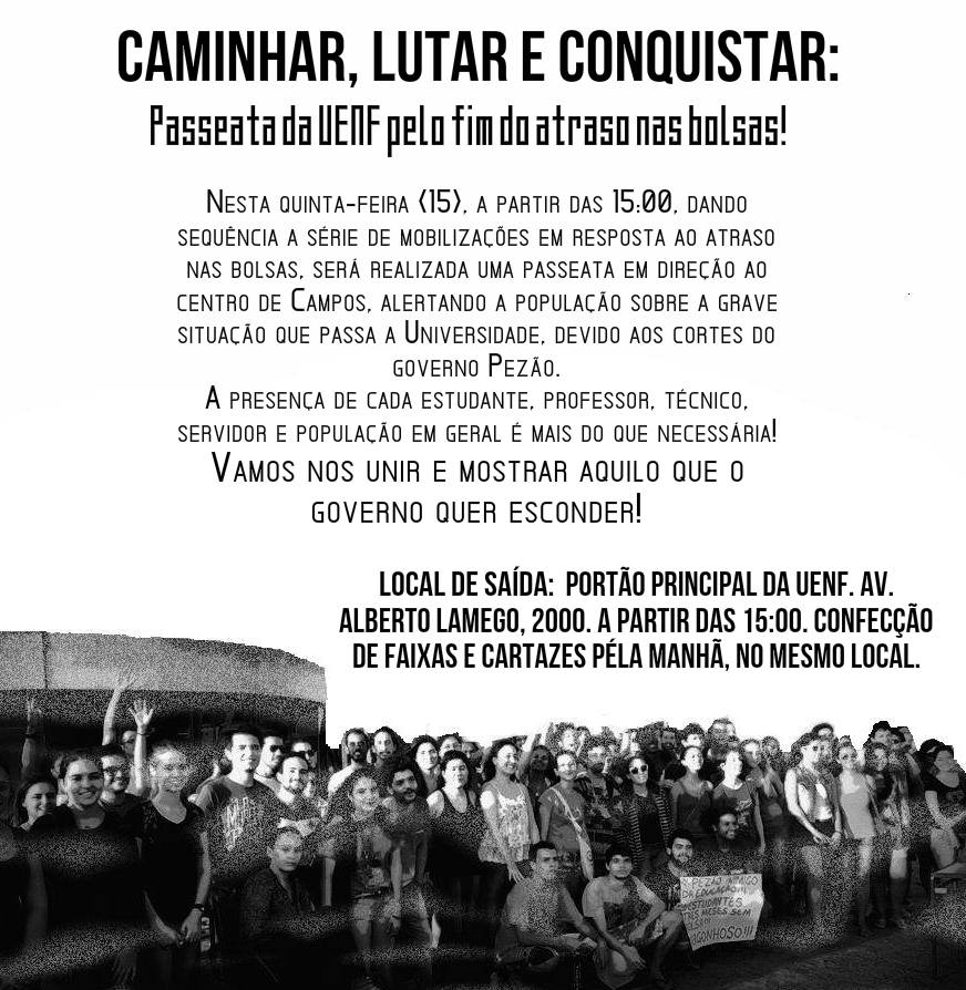 Apesar do mote central do movimento ser o pagamento das bolsas de quase 900 estudantes e profissionais que estão atrasadas desde fevereiro/2015, a passeata também deverá servir para expor outros graves problemas que hoje afetam o funcionamento cotidiano da UENF que está sendo sendo financeiramente estrangulada pelos sucessivos cortes orçamentários impostos pelo (des) governo Pezão.