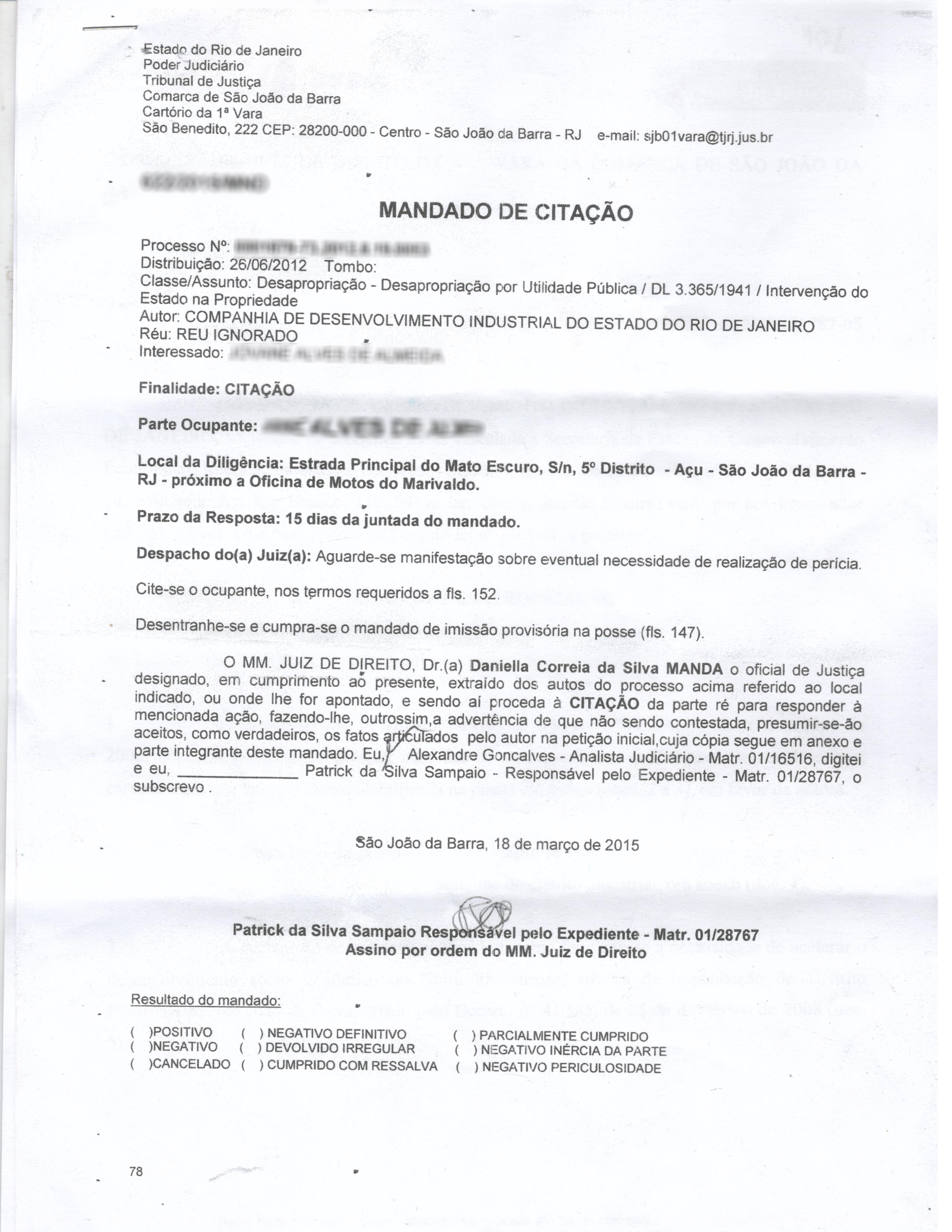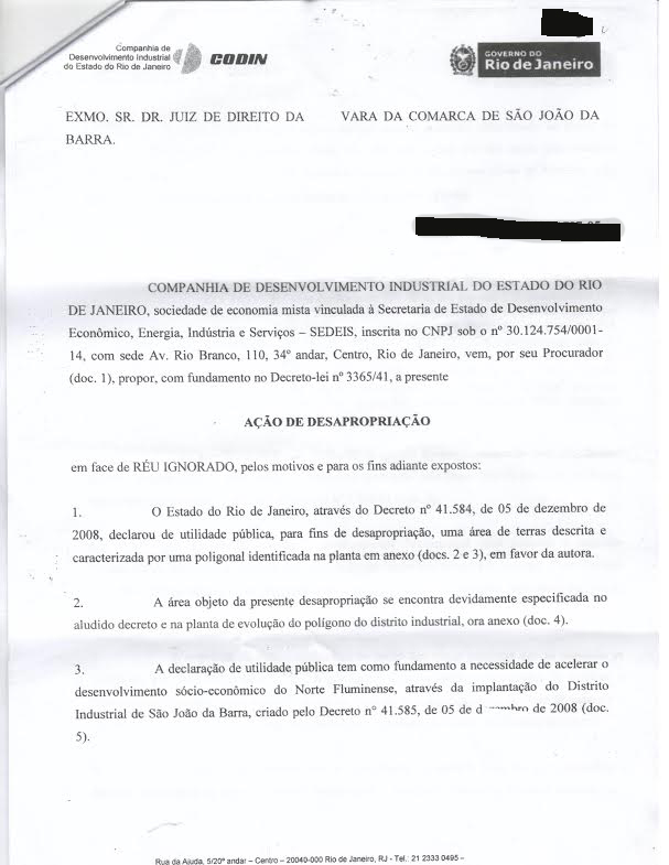 Para quem pensava que as escabrosas desapropriações promovidas pela Companhia de Desenvolvimento Industrial do Rio de Janeiro (CODIN) para beneficiar os herdeiros de Eike Batista no comando do Porto do Açu, aconselho a pensar de novo. É que acaba de me chegar, vejam imagens abaixo, mais uma documentação de um processo de desapropriação de terras promovido pela CODIN (e acatado pela justiça de São João da Barra) para promover o parcelamento de terras de um suposto distrito industrial na região ainda compreendida pelo que se conhece como localidade de Mato Escuro.