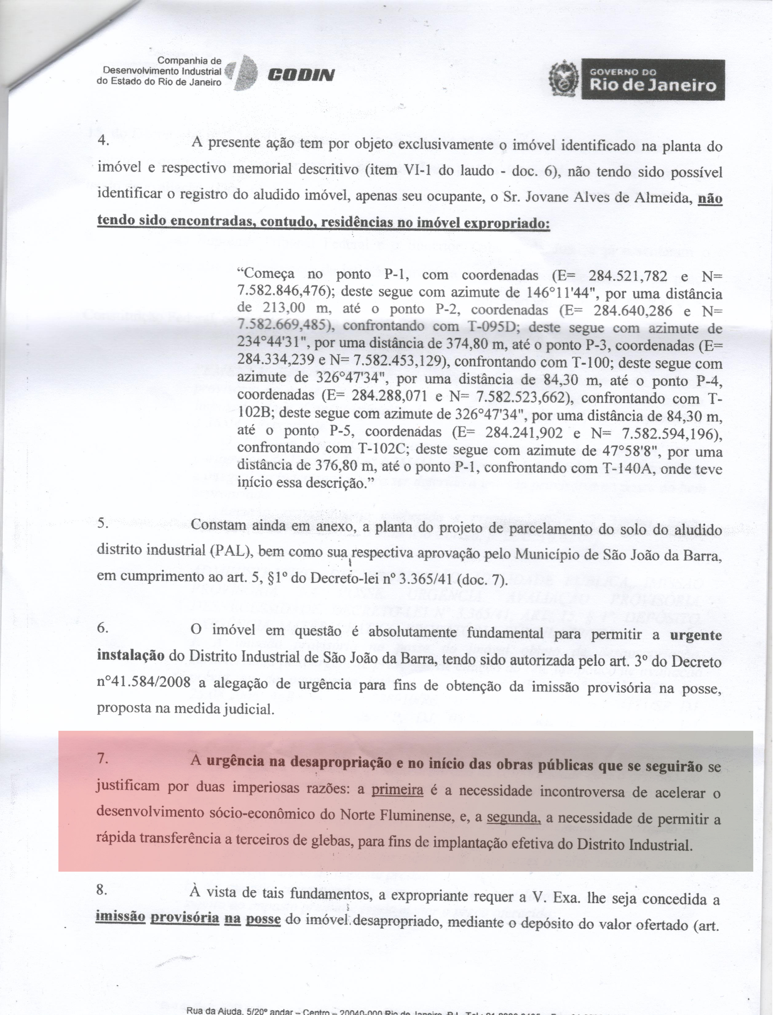 A segunda curiosidade é a declaração de que a “urgência” da desapropriação se deve a dois motivos que, por si só, são reveladores da forma com que essas escabrosas desapropriações foram e estão sendo realizadas. O primeiro motivo chega a ser engraçado…”a necessidade incontroversa de acelerar o desenvolvimento econômico do Norte Fluminense“. Mas é no seguinte motivo que a coisa fica evidente…. “a necessidade de permitir a rápida transferência de glebas, para fins de implantação efetiva do Distrito Industrial“. Como assim? Desde quando a imissão provisória de posse garante ao ente público a rápida transferência de terras desapropriadas? E mais, quem é que vai garantir a implantação efetiva desse suposto distrito industrial? A Prefeitura de São João da Barra ou a Prumo Logística Global? Como o distrito é para ser municipal, a cosia ficaria esquisita se essa transferência de terras fosse feita em favor da Prumo Logística Global, não é?