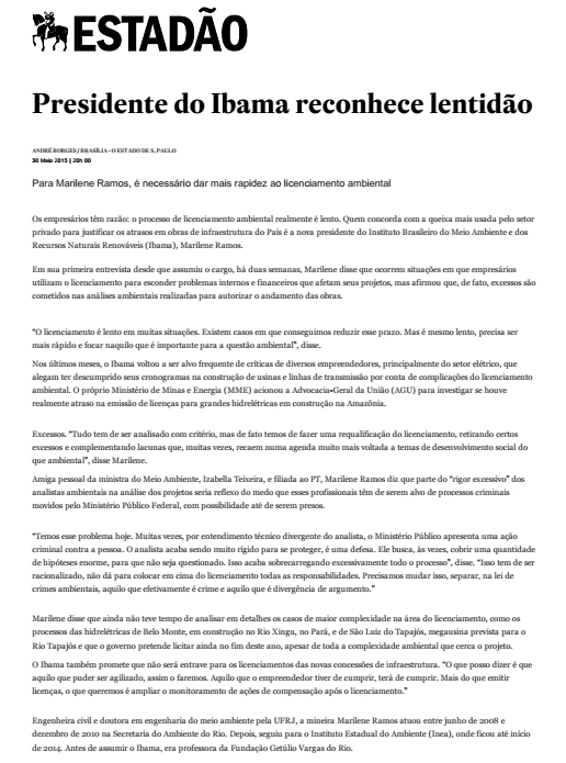 Abaixo posto uma matéria do jornal O ESTADO DE SÃO PAULO, onde a nova presidente do IBAMA, Marilene Ramos, esboça um ataque renovado ao processo de licenciamento ambiental no Brasil, agora a partir do governo federal. Mas quem conhece minimamente a trajetória da ex-presidente do Instituto Estadual do Ambiente (INEA) do Rio de Janeiro não pode ficar surpreso com este tipo de declaração.