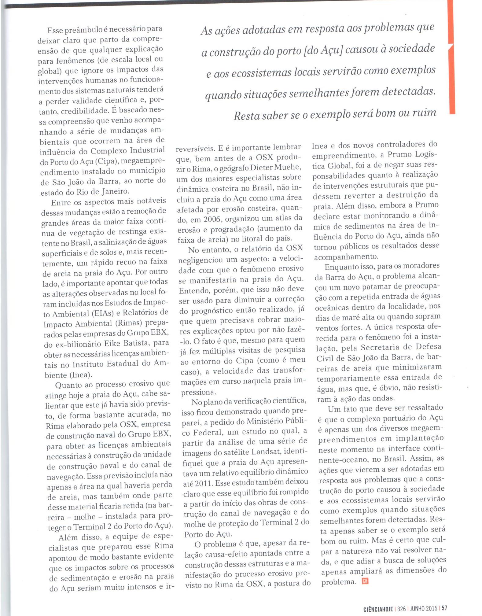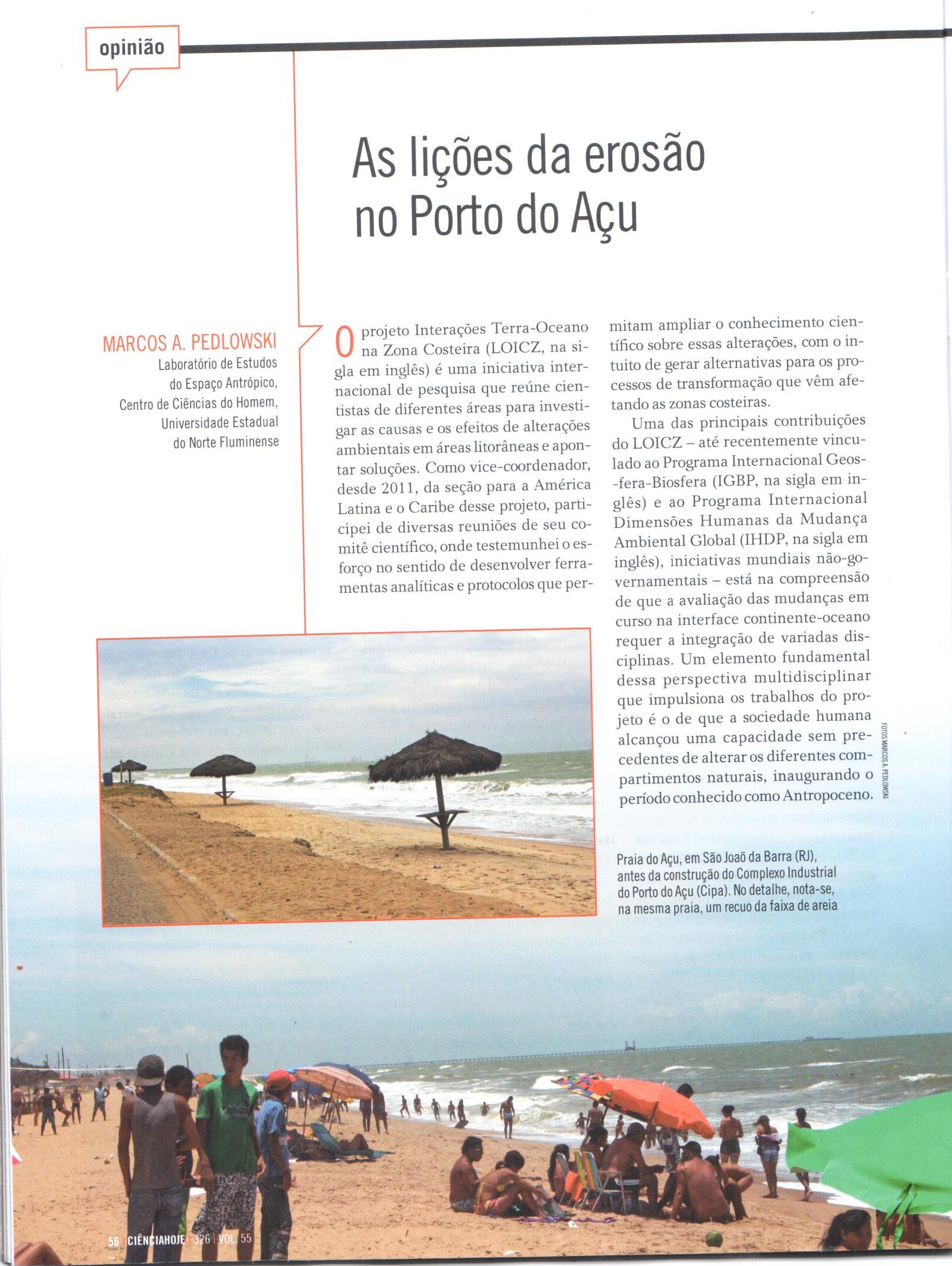 Como já havia informado anteriormente, a Revista Ciência Hoje publicada pela Sociedade Brasileira para o Progresso da Ciência (SBPC) publicou em seu número 326, volume 55, um artigo de opinião de minha autoria sobre o processo de erosão ocorrendo na área de influência do Porto do Açu.