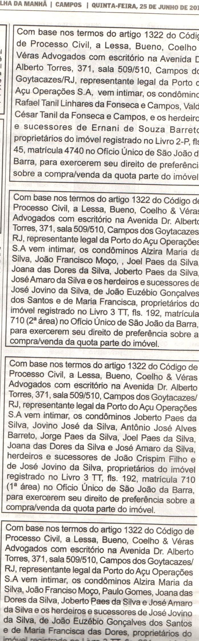 Mas ao ler o conteúdo das convocações feitas por um escritório de advocacia em nome da “Porto do Açu Operações S/A” para que um determinado número de condôminos se manifestem em termos de exercer o seu direito de preferência sobre a compra/venda da quota parte de um determinado imóvel, que suponho estar localizado na área desapropriada pela Companhia de Desenvolvimento Industrial do Rio de Janeiro (Codin) para a implantação do Distrito Industrial de São João da Barra, algumas questões surgem em minha mente: