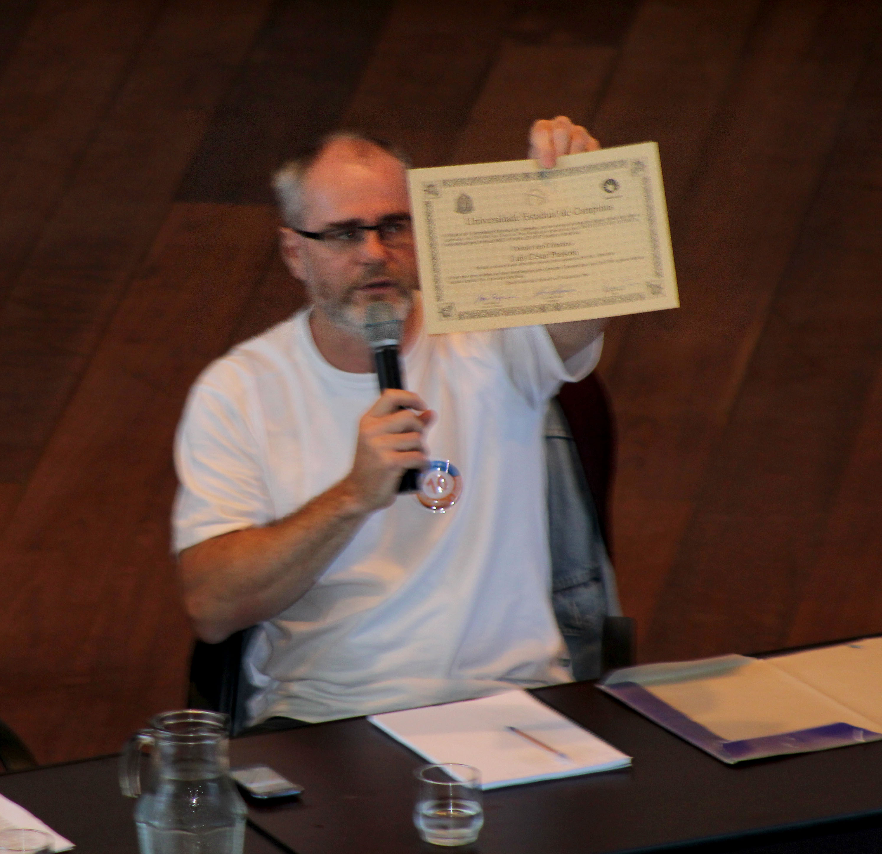 O debate desta 3a. feira teve vários momentos interessantes, e um foi discreto mas muito importante. Logo em sua fala inicial, o candidato a reitor pela chapa de oposição à reitoria, professor Luís Passoni, mostrou o seu diploma de doutor pela Universidade Estadual de Campinas (Unicamp) como mostra a imagem abaixo.