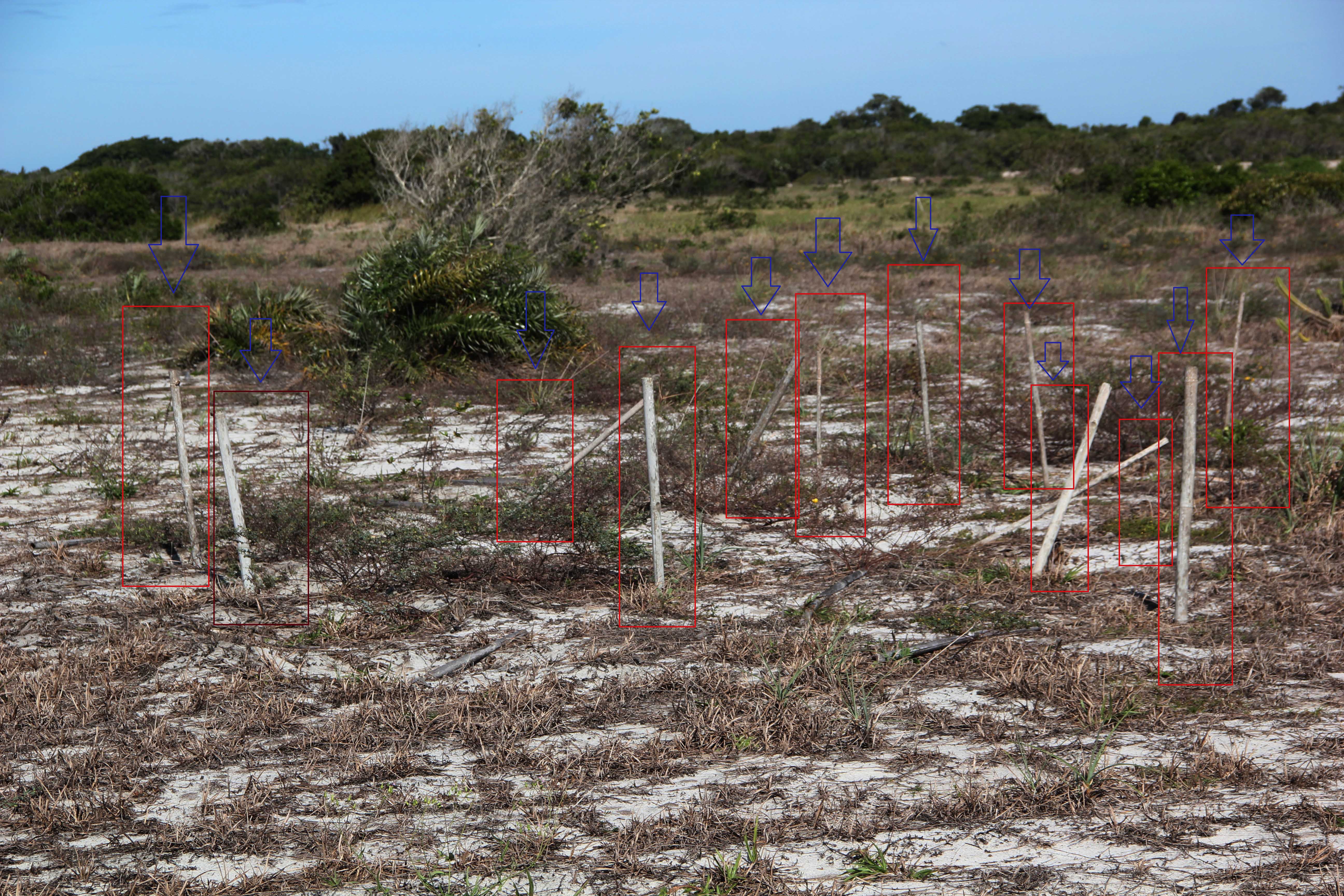 Estacas de bambu desacompanhadas das mudas que sustentava mostram alta taxa de mortalidade afetando os esforços de regeneração da RPPN Fazenda Caruara.