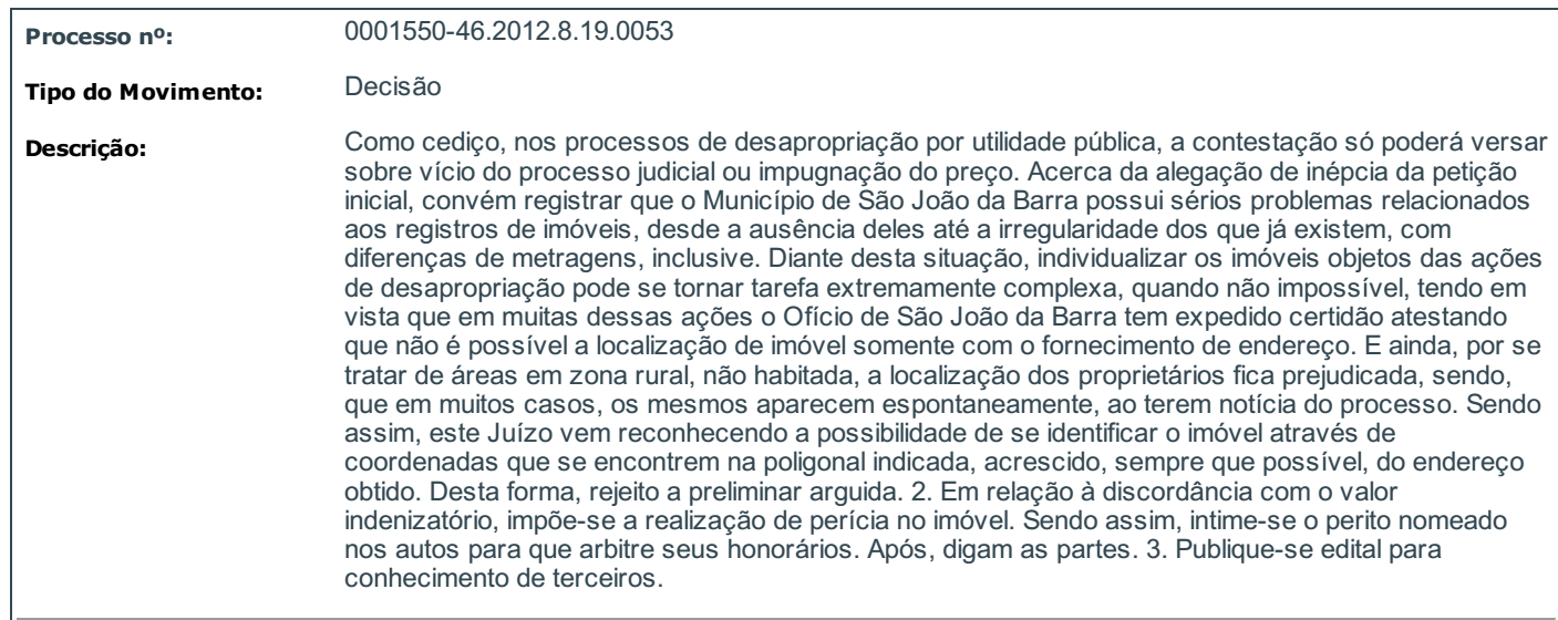 “Convém registrar que o Município de São João da Barra possui sérios problemas relacionados aos registros de imóveis, desde a ausência deles até a irregularidade dos que já existem, com diferenças de metragens, inclusive. Diante desta situação, individualizar os imóveis objetos das ações de desapropriação pode se tornar tarefa extremamente complexa, quando não impossível, tendo em vista que em muitas dessas ações o Ofício de São João da Barra tem expedido certidão atestando que não é possível a localização de imóvel somente com o fornecimento de endereço. E ainda, por se tratar de áreas em zona rural, não habitada, a localização dos proprietários fica prejudicada, sendo, que em muitos casos, os mesmos aparecem espontaneamente, ao terem notícia do processo.