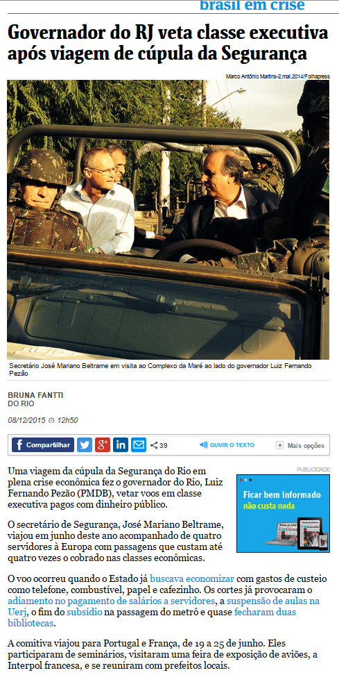 Pelo que mostra a matéria abaixo, quando o cinto das universidades estaduais e outros órgãos já estavam sendo furiosamente apertados, o secretário José Mariano Beltrame e outros membros da cúpula da segurança (ou seria insegurança?) do Rio de Janeiro viajaram em classe executiva para a Europa, pagando valores quatro vezes superiores às das classes econômicas!