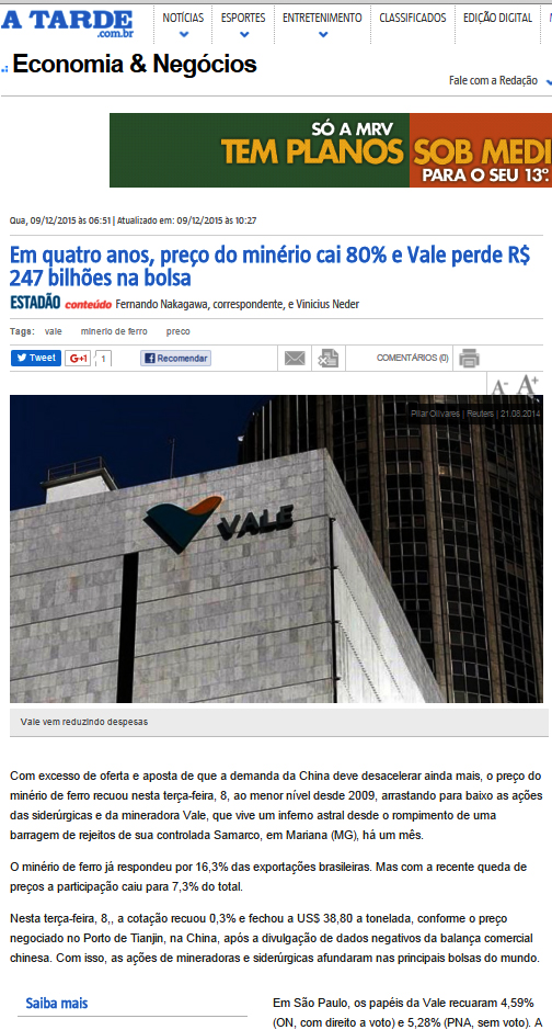 Como havia notado em minha postagem anterior, enquanto o Estado brasileiro continua livrando a cara da Vale e da BHP Billiton que controlam a Mineradora Samarco de forma salomônica, o mercado de ações continua punindo de forma dolorida. É esta punição que já vinha ocorrendo com a desvalorização do minério de ferro que está sendo brutal em 2015, o incidente em Mariana que gerou o TsuLama da Samarco foi a gota d´água para muitos investidores que resolveram se livrar dos papéis da Vale.