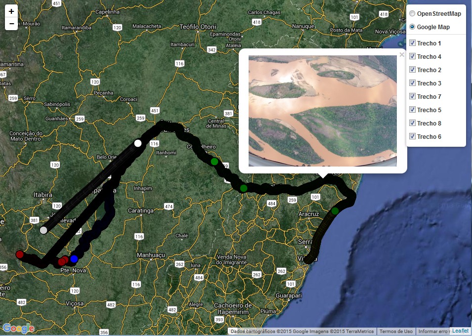 Para visualizar as fotos, selecione os trechos de voo no lado direito superior da tela e a imagem de fundo de sua preferência (Google Maps ou Open Street Map). É só clicar nos pontos vermelhos para ter acesso às imagens.