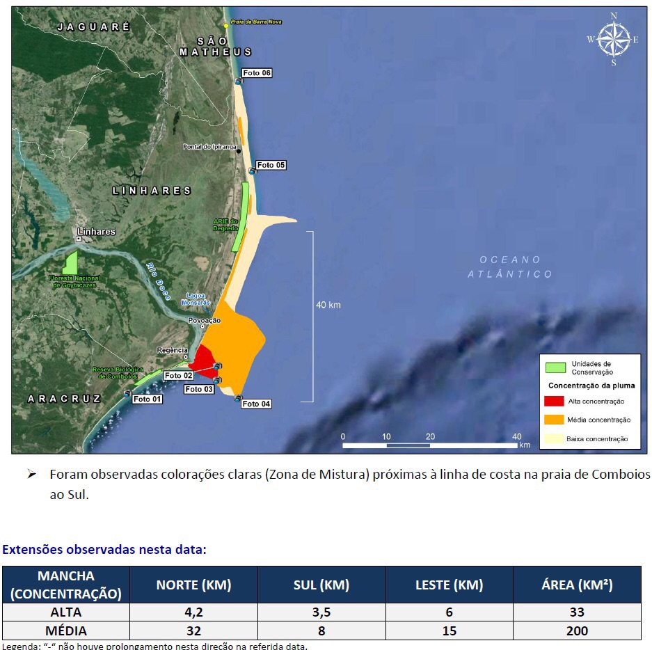 ,“É importante ressaltar que situação atual da pluma não reflete tendência de movimentação para os próximos dias, tendo em vista que o sedimento, que está na superfície da água, é bastante influenciado pela ação dos ventos “, disse a coordenadora-geral de Emergências Ambientais do Ibama, Fernanda Pirillo.