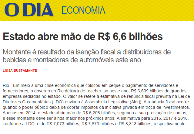 O argumento sendo vendido por Pezão e sua trupe é de que vivemos uma crise sem precedentes e que estaria ligada à crise geral pela qual passam o Brasil e o resto do mundo. Não bastasse o fato de que a maioria dos estados e municípios brasileiros estão honrando suas obrigações trabalhistas com seus servidores, a notícia abaixo que foi publicada no dia 12 de Dezembro de 2015 mostra que sob a égide do PMDB e de Pezão, a crise que consome o Rio de Janeiro é acima de tudo seletiva.