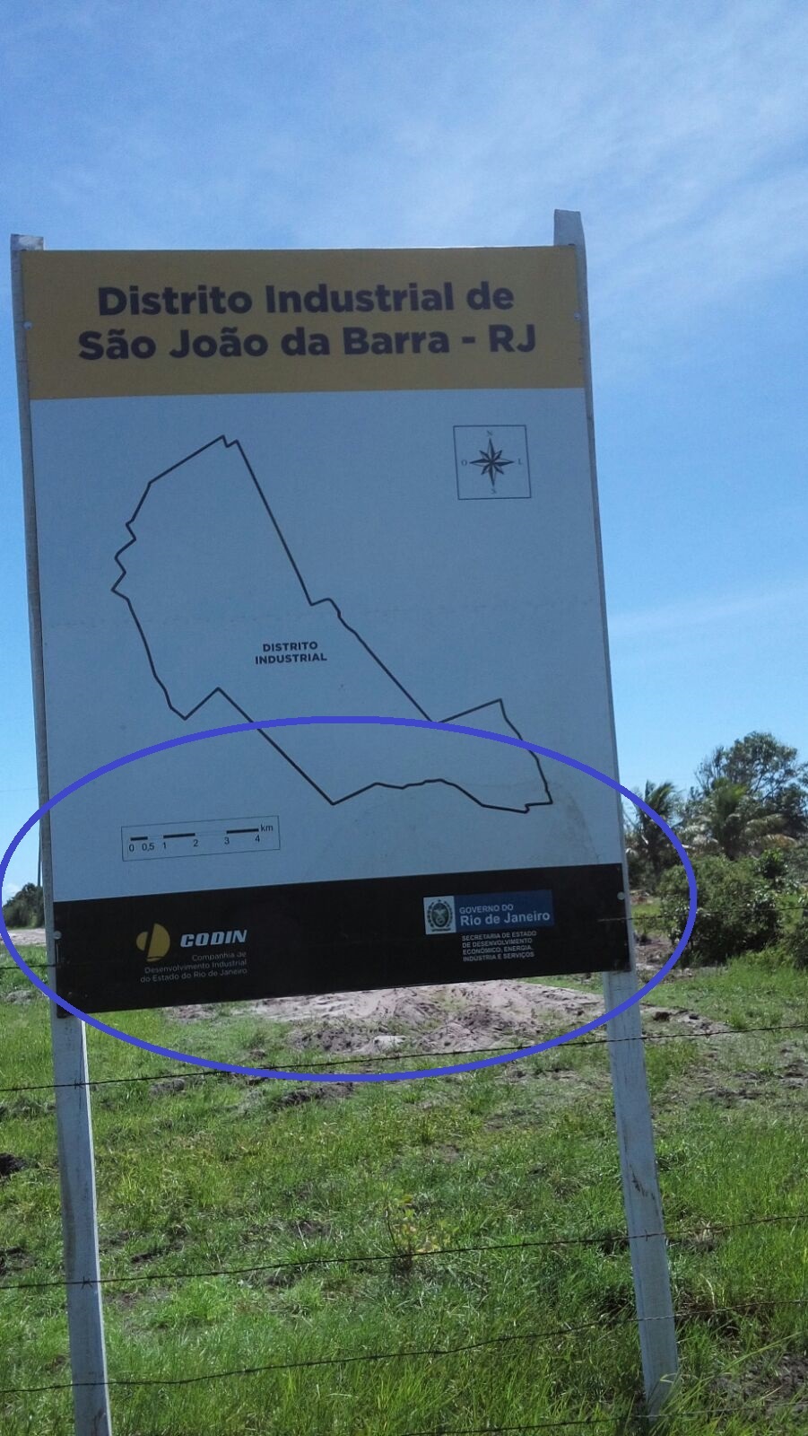 Na imagem da esquerda se vê, uma placa colocada pela Codin atestando que uma propriedade expropriada seria de sua “propriedade privada”, bem ao lado do Sítio do Birica. Esta placa ficou na área por quase dois anos, até que foi substituída agora colocando a propriedade expropriada dentro do natimorto “distrito industrial de São João da Barra”.