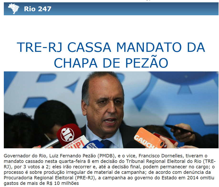 TRE aumenta calvário de Pezão e cassa seu mandato por abuso do poder econômico