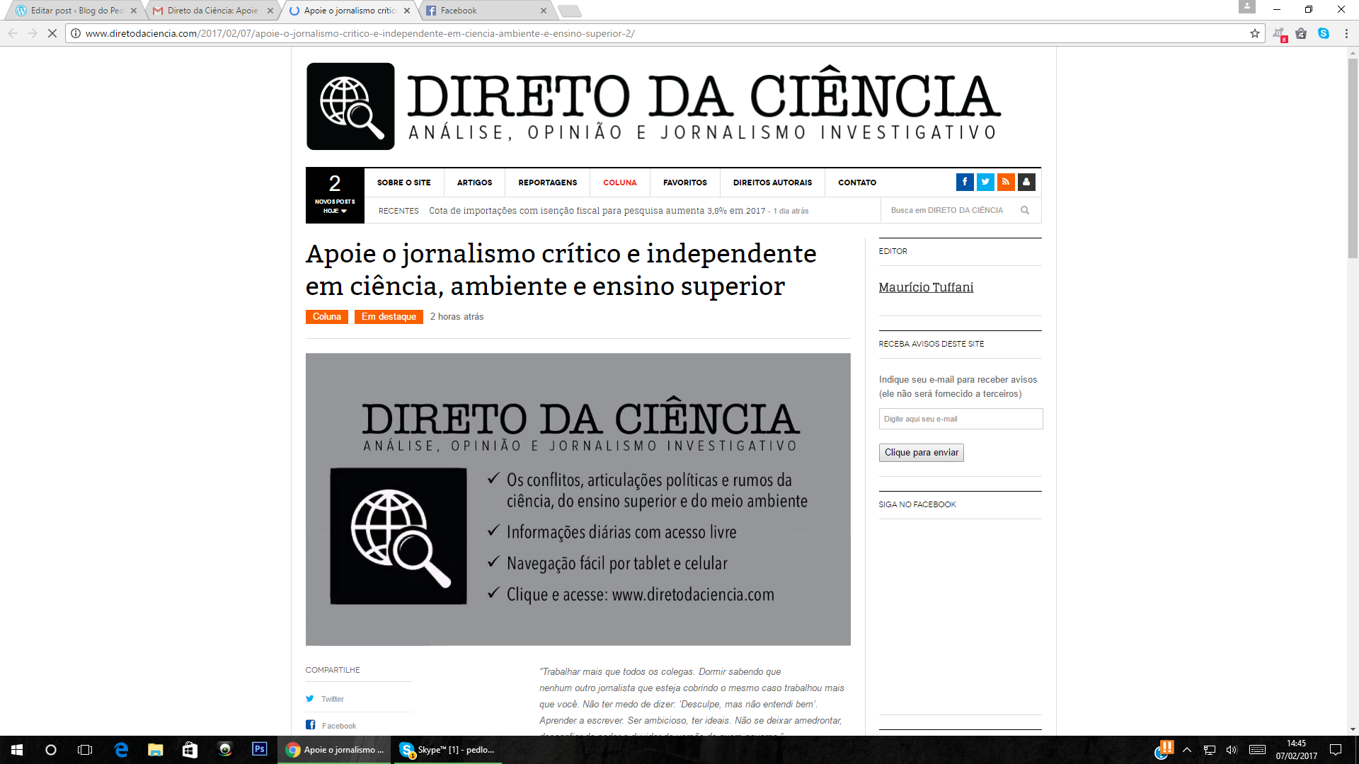 Porque apoio a campanha de captação de recursos do “Direto da Ciência”