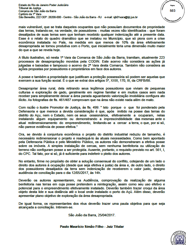 Conflito agrário do Porto do Açu: juiz indefere pedido de reintegração e marca audiência de conciliação