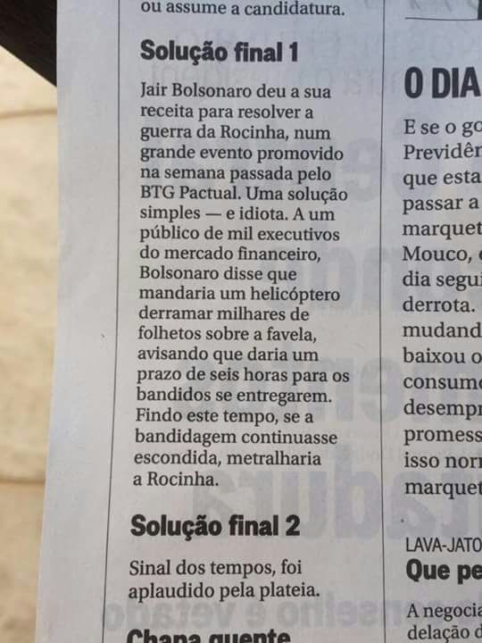 A imagem abaixo vem da coluna do jornalista Lauro Jardim e o conteúdo apresenta o que seria a solução dada pelo deputado Jair Bolsonaro para o problema da violência que torna a vida dos habitantes das favelas do Rio de Janeiro num desafio cotidiano.