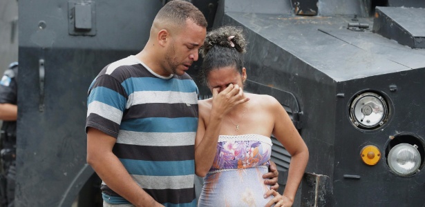 Casal chora após destruição de quiosques na Vila Kennedy.