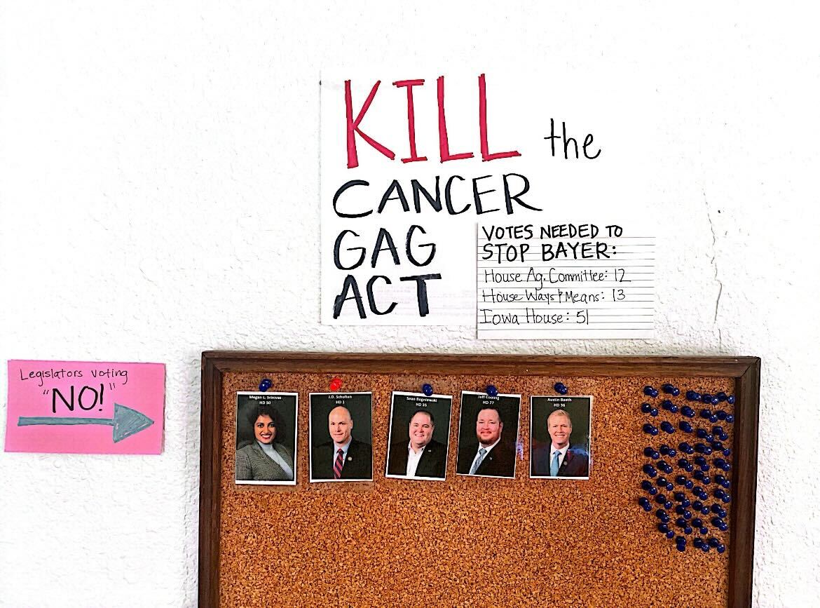 A luta é particularmente feroz agora em Iowa, onde os oponentes chamam a lei proposta apoiada por agrotóxicos de “Cancer Gag Act”, devido aos altos níveis de câncer em Iowa que muitos temem estar ligados ao grande uso agrícola de agrotóxicos no estado. Iowa tem a segunda maior taxa de novos casos de câncer nos EUA e a taxa de câncer que mais cresce.