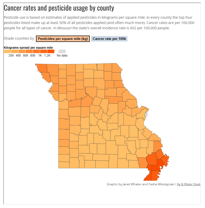 A Universidade do Missouri (MU), em parceria com a Investigate Midwest, conduziu uma análise condado por condado das taxas de câncer e uso de agrotóxicos, usando os dados mais recentes disponíveis para pesticidas que são repetidamente citados em pesquisas como provavelmente associados ao risco de câncer.