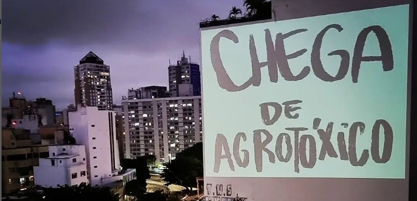 Mensagem de repúdio ao Pacote do Veneno projetado em edifício. Foto @projetemos