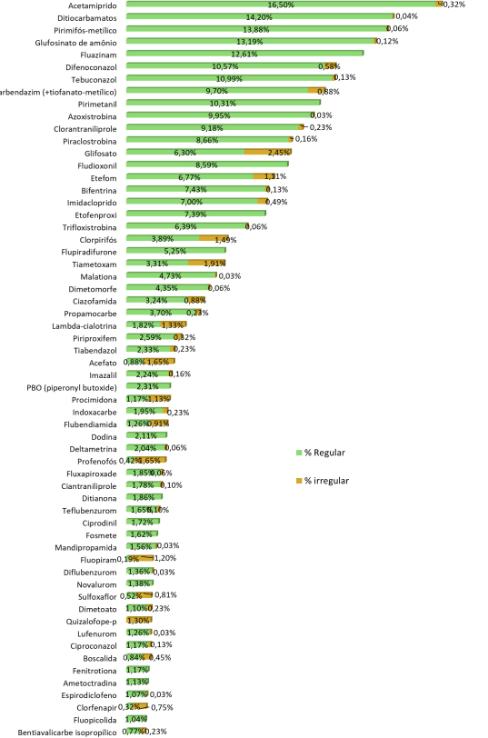 Entre os problemas identificados, 12% do total de amostras tinham resíduos de agrotóxicos não permitidos para a cultura analisada; 5,6% apresentaram resíduos acima do limite permitido; e 0,1% continham substâncias proibidas no Brasil. As demais amostras foram consideradas satisfatórias: em 26% não houve detecção de resíduos e, em 54%, foram encontrados agrotóxicos nos alimentos, mas dentro dos limites permitidos.