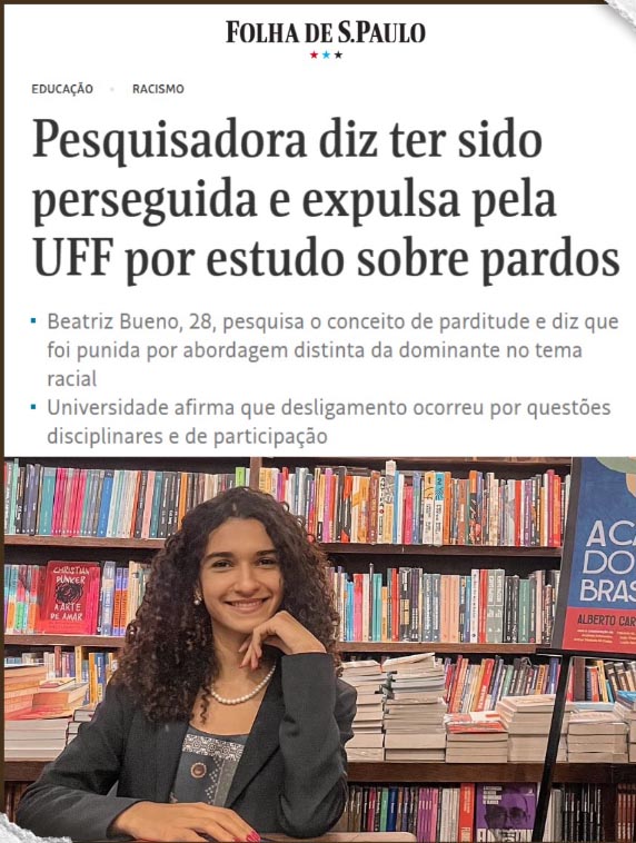 Venho acompanhando o caso envolvendo agora ex-mestranda Beatriz Bueno, que acaba de ser desligada do programa de mestrado em Cultura e Territorialidades da Universidade Federal Fluminense por supostas violações das regras acadêmicas. Betriz Bueno alega que, na verdade, sua exclusão dos quadros discentes da UFF se deve à rejeição do seu tema de pesquisa, que propõe uma reorientação (radical eu me arrisco a dizer) sobre a questão das relações raciais tem sido abordadas nas últimas décadas pelas universidsades brasileiras.