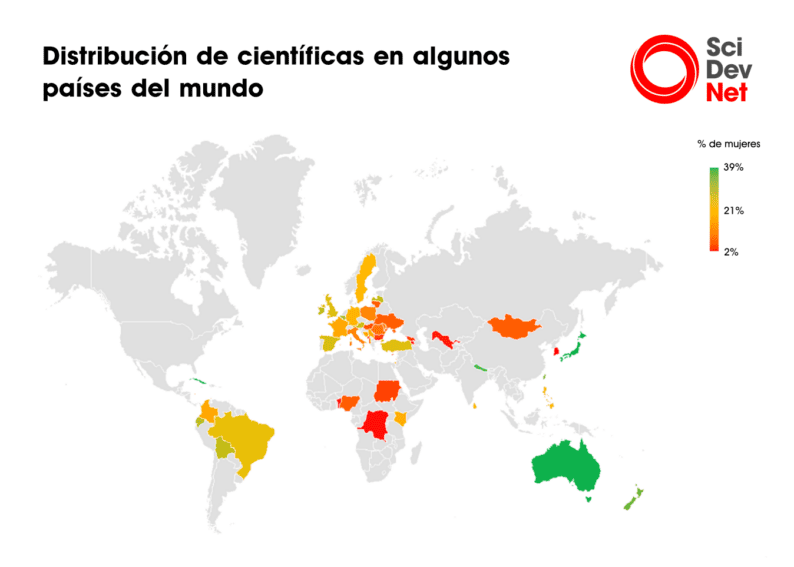 Distribuição de cientistas em alguns países do mundo. Fonte: Conselho Internacional de Ciência, Parceria Interacadêmica e Comitê Permanente para a Igualdade de Gênero na Ciência (fevereiro de 2026). Rumo à igualdade de gênero nas organizações científicas: avaliação e recomendações. DOI: 10.24948/2026.03