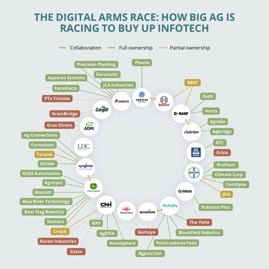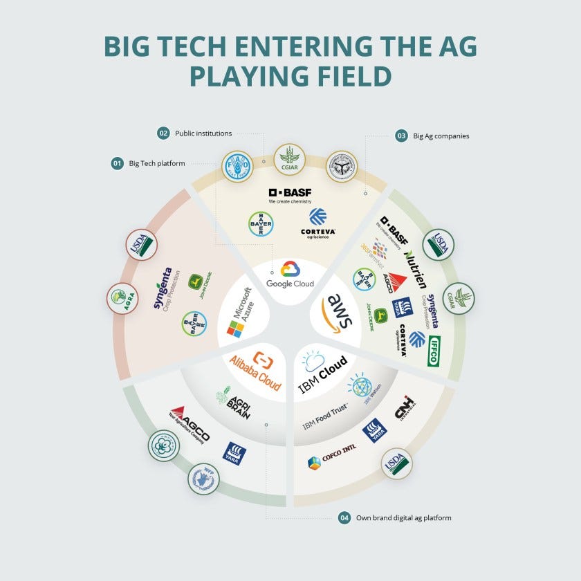 Em várias regiões, grandes empresas de tecnologia, incluindo Amazon, Microsoft, Google e Alibaba, uniram forças com gigantes do agronegócio nas indústrias de sementes, agroquímicos e máquinas agrícolas. O resultado é uma infraestrutura digital cada vez mais integrada que alcança todas as camadas da agricultura industrial.