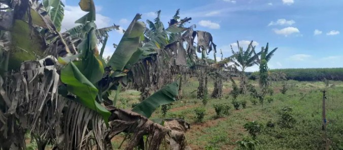 Bananeiras com as folhas secas, provavelmente, impactadas pelo agrotóxico, segundo os moradores. (Foto: Katiuscia Galhera)
