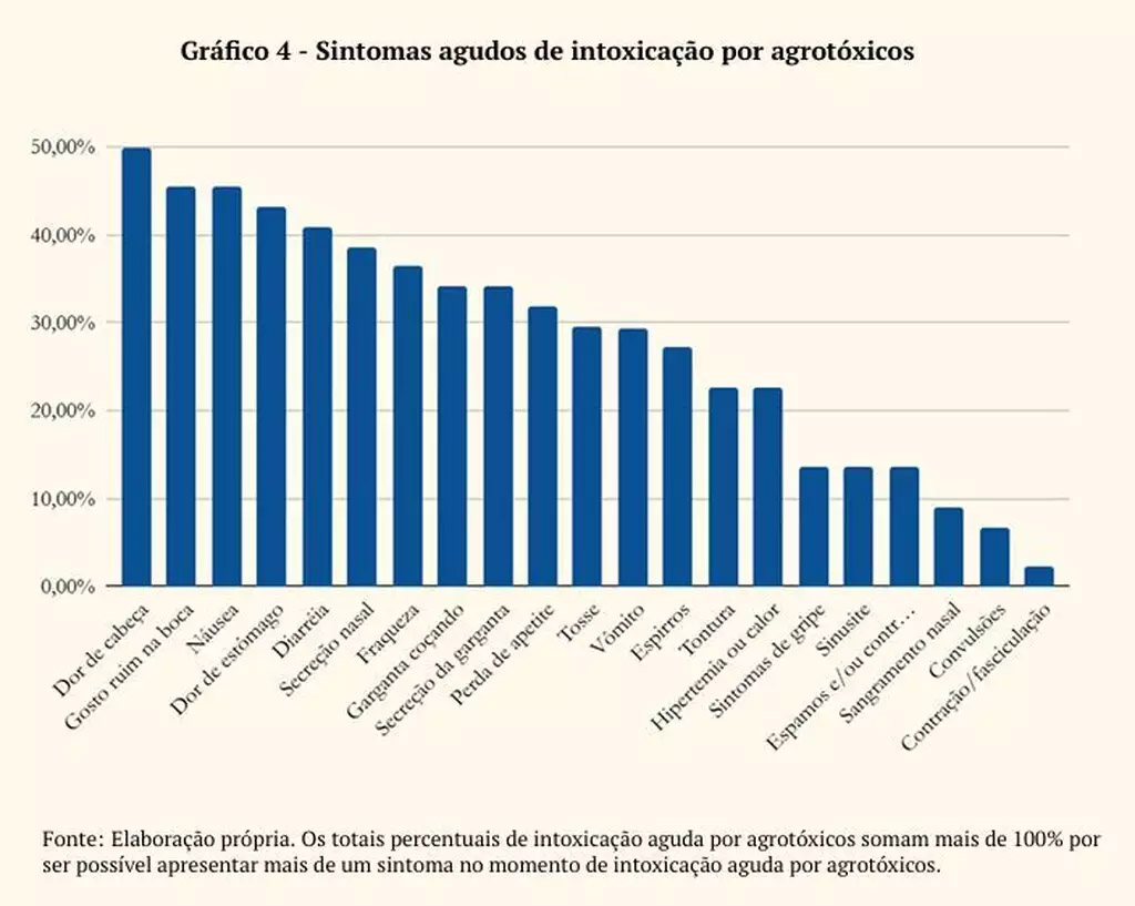 A principal via de intoxicação relatada é a respiratória (82,5%), seguida por contato com pele ou olhos (27,5%) e ingestão de alimentos contaminados (20%). A pulverização terrestre foi mencionada em 85% dos casos, além de aplicações por aeronaves ou drones (47,5%), poeira química (40%) e contaminação da água (32,5%).