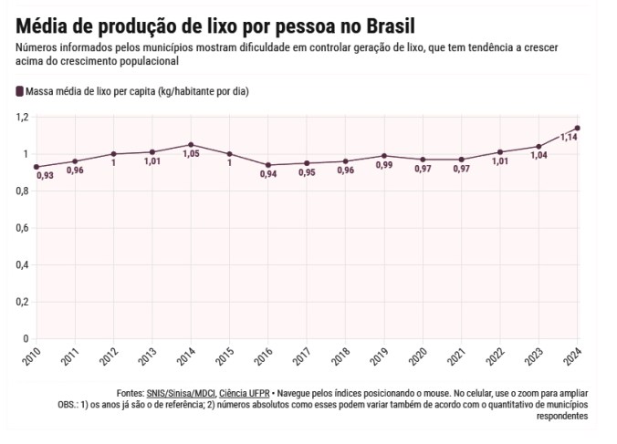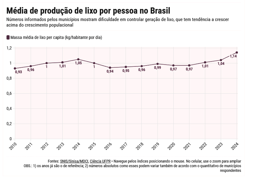 Na base dos problemas de resíduos sólidos no Brasil, existe também a tendência de que a geração de resíduos cresça a uma taxa superior ao crescimento populacional. O estudo publicado em 2024 indica isso: enquanto a população cresceu 0,76% entre 2019 e 2020, a quantidade de lixo coletado aumentou 2,3%. Ou seja, o crescimento populacional não é a única explicação para o aumento do lixo.