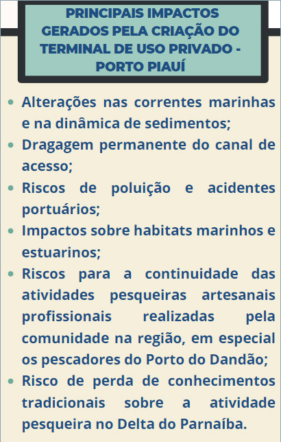 Embora tenham sido realizadas oficinas e reuniões com colônias e associações de pescadores e organizações sociais, pescadores e especialistas apontam fragilidades no processo: elaboração inicial do plano de consulta sem participação das comunidades; ausência de assessoria técnica independente para apoiar os pescadores; curto prazo de realização das oficinas; falta de compromissos concretos assinados, prazos e responsabilidades financeiras definidas pelos acordos anunciados pelo governo do Piauí ; remoção de pescadores artesanais profissionais tradicionais do Porto do Buraco do Dandão,devido à ampliação e consolidação do TUP.